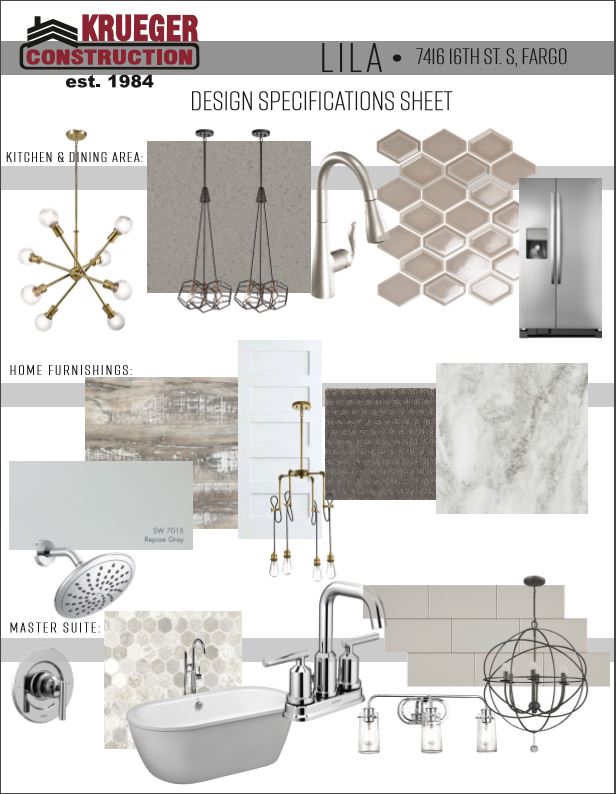 Below see a design specifications sheet so you can get an idea of the sleek finishes used in creating this home! Click our 'Available Homes' tab on our website to view more information about this home at 7416 16th St. S, Fargo. Call our office at 701-239-0015 to schedule a showing!